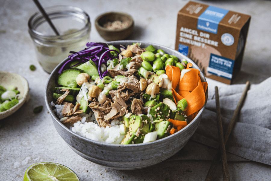 Frisch, bunt, ausgewogen: Diese Bowl mit Thunfisch, Edamame, Avocado und Tahin bringt nicht nur cremigen Umami-Geschmack auf den Teller, sondern auch 30 g Protein pro Portion. Der handgeangelte Thunfisch von den Malediven fügt sich nahtlos ein in die cleanen Zutaten – keine Tricks, keine Zusätze, nur ehrlicher Geschmack.