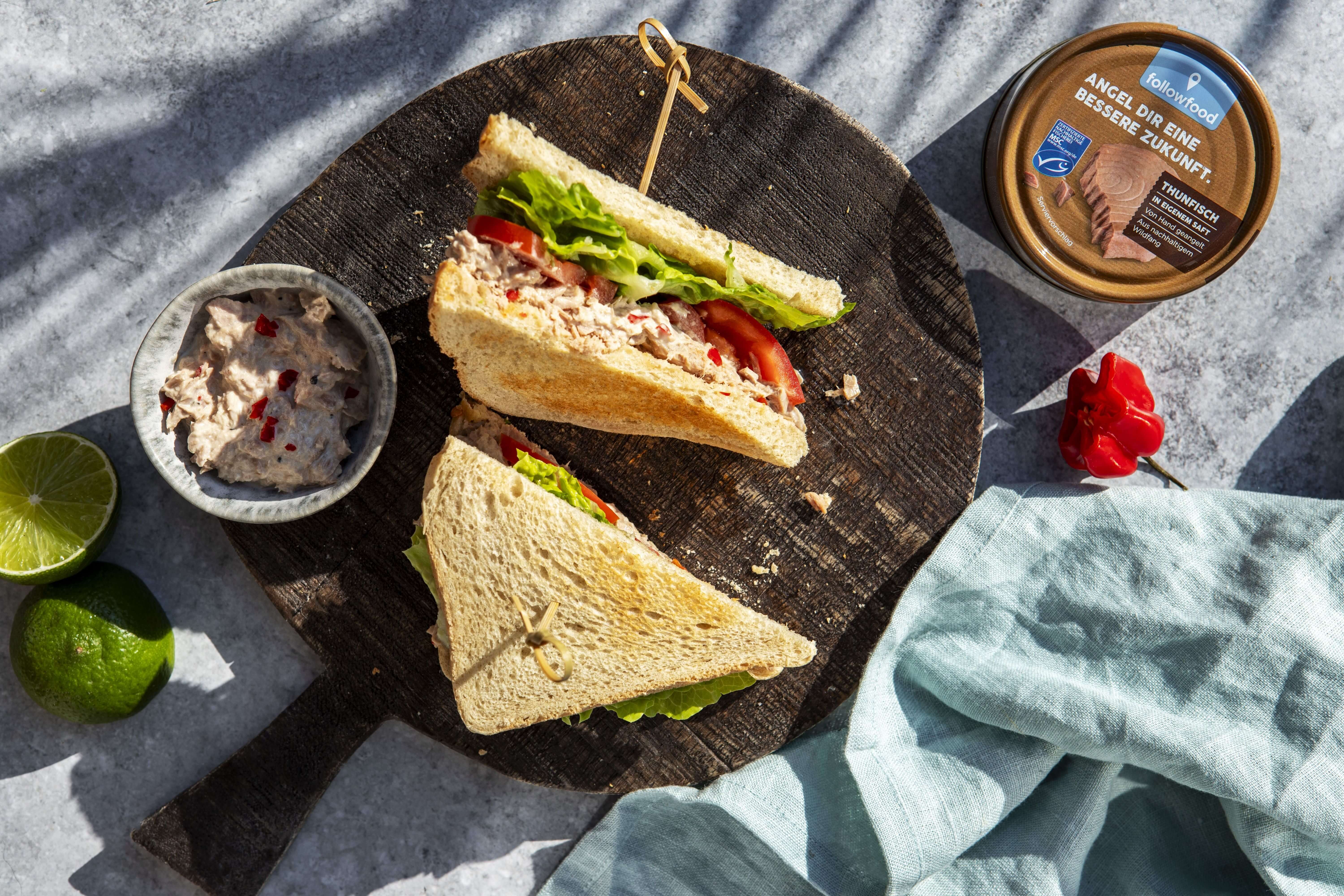 - Dann das Brot mit der Thunfischcreme bestreichen und mit den Tomatenscheiben und Salat belegen. Zweites Brot darauflegen und genießen.