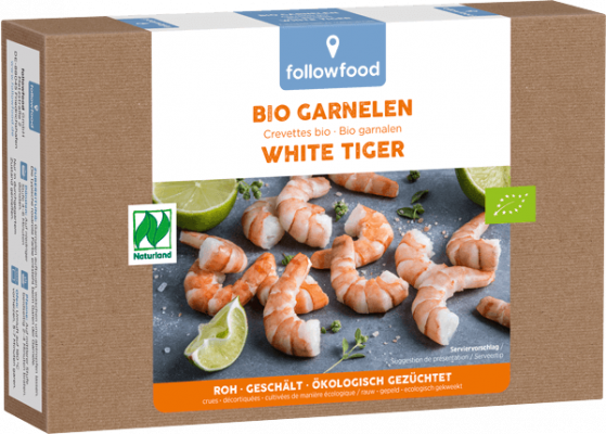 Diese Bio-Garnelen stammen aus einem Naturland-Projekt in Ecuador, Peru und Honduras, wo sie in zertifizierten Teichsystemen aufwachsen und zudem die umliegenden Mangrovenwälder schützen. Die Betriebe garantieren ideale Wachstumsbedingungen für die ökologische Aufzucht der Garnelen.