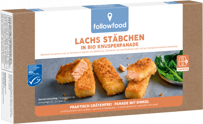 Das Herz unserer Lachs-Stäbchen bildet Wildlachs. Dieser Lachs wird von zertifizierten Fischereien gefangen, welche die Kriterien des MSC und unsere followfood Fischerei-Richtlinien erfüllen. Da es sich bei dem Fisch um Wildfang handelt, kann er nicht Bio-zertifiziert werden. Für die knusprige Hülle kommen aber selbstverständlich nur hochwertige Bio-Zutaten zum Einsatz.