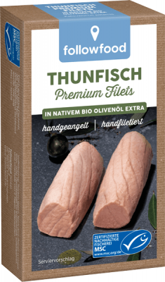 Die followfood Thunfisch Premium Filets in Bio-Olivenöl sind eine wahre Delikatesse aus der Dose. Ob zum Abendbrot oder als Salat Topping - die zarten, saftigen, von Hand filetierte Premiumstücke verwandeln jedes deiner Gerichte in ein kleines Gourmet Dinner. Wie bei unseren anderen Dosenprodukten, stammt der Thunfisch aus einer der wohl nachhaltigsten Fischereien: Der Angelruten-Fischerei auf den Malediven. Hier werden die Thunfische noch einzeln mit einer Angelrute gefischt.