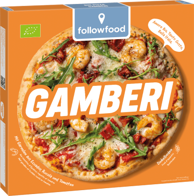 Wenn würziger Rucola und marinierte Tomaten auf unsere followfood Bio-Garnelen treffen. Die Pizza Gamberi wird in einem kleinen Ort, der zu Friaul-Julisch Venetien in Norditalien gehört liebevoll von Hand belegt. Die Produktion ist ganz auf Nachhaltigkeit ausgerichtet: Grüner Strom und die stetige Verringerung des CO2-Ausstoßes sind dabei selbstverständlich!